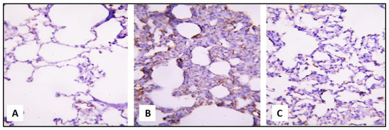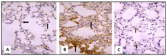 H&E-stained lung section of group II revealed that most lung tissues were negatively affected. The intralveolar septa were thickened; they were also populated with mononuclear cellular infiltration. Narrowed alveolar spaces were seen in some areas, whereas dilated alveoli were noticed in other areas. Extravasation of red blood cells was observed, together with homogenous acidophilic material, in the alveolar lumen. Congestion of the pulmonary vessels and hyperplastic pneumocyte type II were also noticed (Figure 5A,B). The bronchial passages showed desquamation and shedding of their lining epithelium. Desquamated cells and cellular debris were seen in the lumina of some bronchial passages. The epithelial cells that bordered the bronchiole showed strongly pigmented nuclei (Figure 5C).
