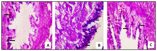 A section of rat lung showing the following features. (A) PAS-positive cells (↑) in the epithelium of a large bronchus of the control group (PAS stain, ×400). (B) An apparent increase in the PAS-positive cells in the bronchial passage lining epithelium of group II (PAS stain, ×400). (C) The PAS-positive cells in the lining epithelium of a large bronchial passage of group III is relatively comparable to the control group (PAS stain, ×400).