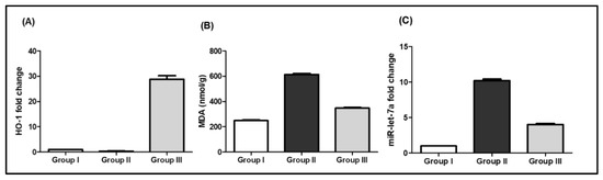Levels of the studied markers in the lung tissues of the different groups (A) Relative expression of HO-1 mRNA. (B) MDA levels. (C) Relative expression of miR-let-7a. Data are expressed as mean ± SD.