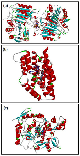 Furthermore, docking in the iNOS was performed, and all compounds were positioned near the heme molecule (Figure 11). RUT and ELL showed direct interactions with the heme molecule, and the H-bonds showed direct interactions with the nearby amino acids (Figure 14). On the other hand, CAT, CHL, GAT, and CAT showed no direct interaction with the heme and depended mainly on the H-bond interactions.