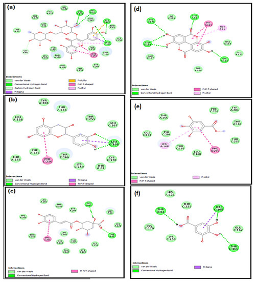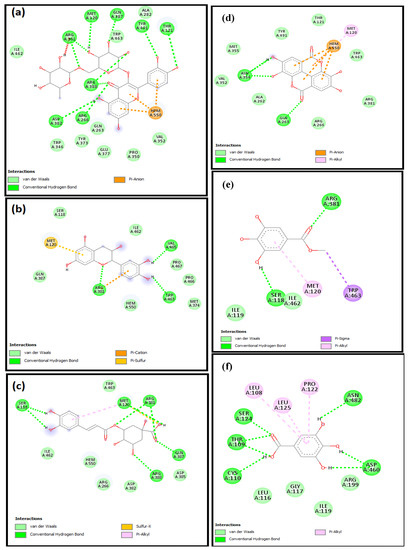 The 2D schematic interactions of docked (a) RUT, (b) CAT, (c) CHL, (d) ELL, (e) GAT, and (f) GAL into the caspase-3 protein (Code: 3DEI).
