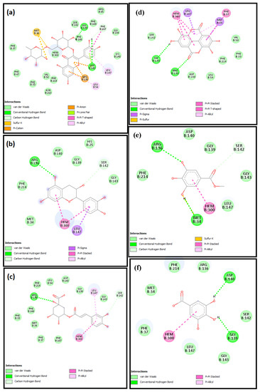 The 2D schematic interactions of docked (a) RUT, (b) CAT, (c) CHL, (d) ELL, (e) GAT, and (f) CAT with human HO-1 (Code: 3CZY).