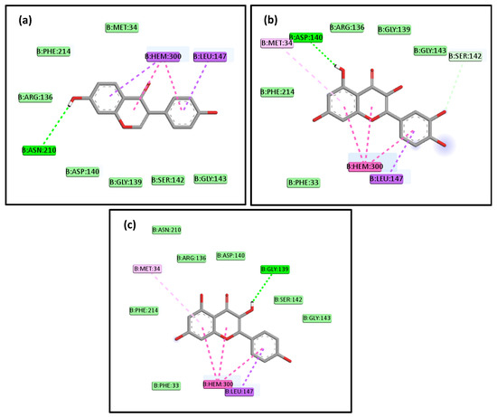 The 2D schematic interactions of docked daidzein (a), quercetin (b), and kaempferol (c) with human HO-1 (Code: 3CZY).