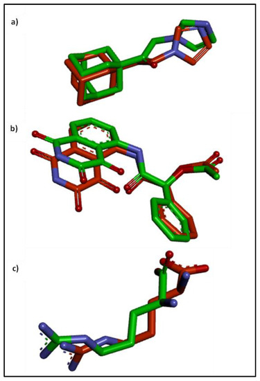 Overlay of the docked and co-crystalized ligand of (a) HO-1 (RMSD = 1 Å), (b) caspase-3 (RMSD = 1.118 Å), and (c) inducible nitric oxide synthase (RMSD = 1.496 Å) enzymes.