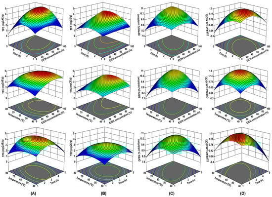 The three-dimensional (3D) response surface plots of RADP extraction on ethanol concentration, time, and temperature for TPC (A), TFC (B), DPPH radical scavenging activity (C), and CUPRAC (D) as a function of significant interaction factors for RSM.