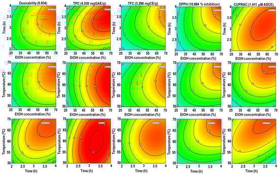 The desirability function optimizes responses for polyphenolic content (TPC and TFC) and antioxidant activity (DPPH and CUPRAC) concurrently. The parameters were forecasted using Derringer’s desirability function, allowing a multivariate analysis to discover the ideal level for all responses in a single extraction []. In this study, the following conditions were used to achieve the maximal overall desirability D = 0.934 (on a scale of 0 to 1): X1, 75%; X2, 3.7 h; and X3, 67 °C. Figure 2 shows the contour plot as a function of ethanol concentration, extraction time, and temperature at optimum condition. To verify the sufficiency of the model equations, a duplicate experiment was conducted in the optimal conditions predicted by Derringer’s desire model. The following results were obtained: TPC = 4.49 ± 1.02 mgGAE/g, TFC = 3.31 ± 0.65 mgCAE/g, % inhibition of DPPH = 11.10% ± 0.78%, and µM ascorbic acid equivalent CUPRAC = 1.43 ± 0.43. As stated in Table 4, the relative standard deviations (RSDs) of TPC, TFC, DPPH, and CUPRAC showed that the predicted values for all groups were very similar to the experimental results. This result is also supported by prior research [].