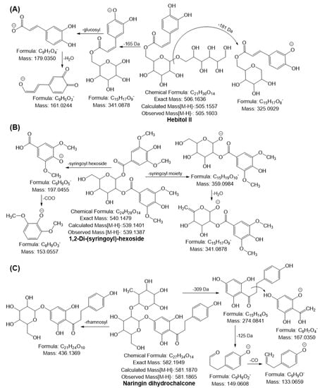 Possible mass fragmentation behavior of identified compounds in RADP. (A) Hebitol II, (B) 1,2-di-(syringoyl)-hexoside, and (C) naringin dihydrochalcone.