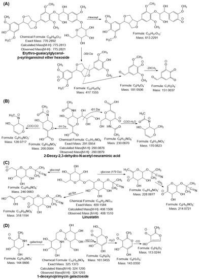 Possible mass fragmentation behavior of identified compounds in RADP. (A) erythron-guaiacylglycerol-β-syringaresinol ether hexoside, (B) 2-deoxy-2,3-dehydro-N-acetyl-neuraminic acid, (C) linustatin, and (D) 1-deoxynojirimycin galactoside.