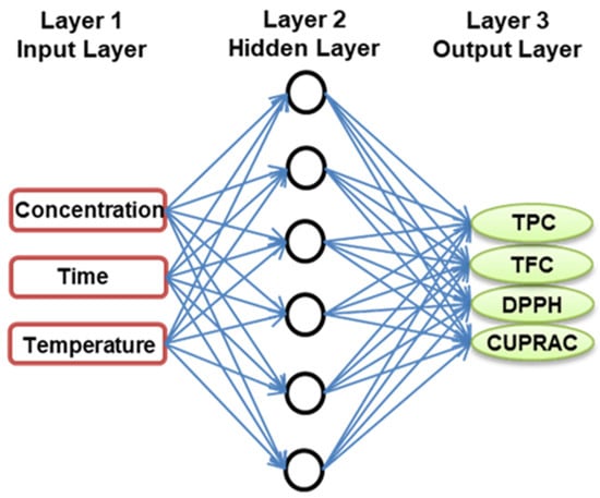 Extraction is the first and most significant step in recovering and purifying bioactive chemicals from plant sources, and it is often accomplished using maceration, distillation, or Soxhlet reflux extraction, but long extraction times and low extraction effectiveness limit these approaches []. For large-scale extraction, the best approach should provide high efficiency with minimal processing time. In general, either empirical or statistical methods can be used to optimize a process [,]. The one-factor-at-a-time technique is an empirical system that involves changing one element at a time while maintaining all other variables constant []. The main limitation of this strategy is that it neglects the interplay between the factors, and hence, it cannot account for all the effects of a parameter on the response. One more burden is that it requires numerous trials to finish the study, thereby increasing the time, costs, and reagent and material consumption []. To solve this challenge, multivariate statistical approaches were adopted for optimizing analytical procedures. One of the most prominent multivariate strategies used in analytical optimization is the response surface methodology (RSM) []. RSM is a collection of statistical and mathematical methodologies for constructing, developing, and adjusting procedures in which many variables impact a desired response, with the purpose of optimizing that response. It can be used to develop, formulate, and create new products, as well as refining the design of current ones. It describes how the independent variables influence the processes, either singly or together. This experimental approach provides a mathematical model that illustrates the chemical or biological procedures in addition to assessing the impact of independent factors [,]. However, any nonlinear relationship between the variables may reduce the forecast accuracy of RSM []. Artificial neural networks (ANNs) are rapidly being utilized as prediction tools in a variety of disciplines, including engineering, owing to their capacity to use learning algorithms to identify input–output links for nonlinear complex systems [].