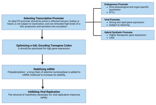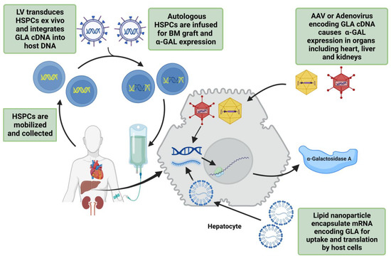 Gene therapies are being developed as a long-term treatment option based on the hypothesis that the targeted cells will overexpress α-GAL, secrete it, and subsequently, other cells will uptake it via mannose-6-phosphate receptors and transport it to the lysosomes. Effective gene therapy requires a transcription promoter active in affected tissues and is optimized for high gene expression, stabilization of mRNA, and inhibiting viral replication (Figure 2). More than two decades ago, Takenka et al. [73] demonstrated that α-GAL was overexpressed and secreted into circulation by the transduced bone marrow cells and remained stable over a significant time. In a study by Medin et al. [74], transduced cells showed a greater than 16-fold increase in enzyme activity and cross-corrected unmodified FD cells. The duration of cross-correction depends on the type of the targeted cells; hematopoietic stem cells [75] or liver hepatocytes with prolonged lifespans can lead to prolonged enzyme expression.