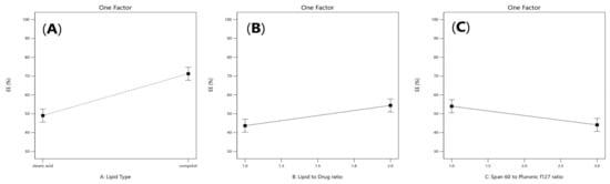Linear plot of main effect of lipid type (X1) (A), lipid to drug ratio (X2) (B), and span 60 to pluronic F127 ratio (X3) (C) on entrapment efficiency (EE%).