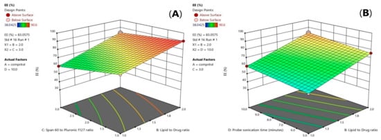 3D-diagram of effect of three factor interaction (3FI) of both (BC) interaction (A) and (BD) interaction (B) on entrapment efficiency (EE%). Note: B, lipid to drug ratio; C, span 60 to pluronic F127 ratio, and D, probe sonication time.