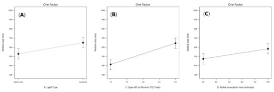 Particle size values of (ATM- loaded SLNs) formulations ranged from 320.9 ± 110.81 to 936.7 ± 229.6 nm as demonstrated in Table 1. The factors that had a significant effect on the particle size according to the ANOVA test results, are the lipid type (X1), span 60 to Pluronic f127 ratio (X3) and the probe sonication time (X4). As shown in Figure 3A, it was observed that the formulae prepared from stearic acid had significantly smaller particle size values than the formulae prepared from Compritol 888 ATO (p = 0.035), which could be related to the chemical composition of glyceryl dibehenate (i.e., Compritol ATO 888) which is a mixture of diacylglycerols, together with monoacylglycerols and triacylglycerols in addition to the long alkyl chain of dibehenic acid (C22). On the other hand, stearic acid is composed of a saturated chain of 18 carbon atoms [23]. Moreover, the higher amount of drug entrapped in Compritol-based SLNs lead to formation of larger particle size SLNs. It was reported that there is a direct relationship between particle size and EE% as the particle size depends on the distance between the SLNs bilayers, which is increased because of the inclusion of more drug molecules within the lipid core [24]. As shown in Figure 3B, a direct relationship was observed between the particle size enlargement and span 60 (HLB = 4.7) to Pluronic f127 (HLB = 22) ratio; (p = 0.0010), as Pluronic F127 have significant ability to incorporate hydrophilic drugs and self- assemble into small nanosized solid lipid nanoparticles [25]. As shown in Figure 3C, it was also found that increasing the probe sonication time (from 5 min to 10 min) had negative effect on particle size reduction (p = 0.022). The transformation of the solid lipid (Compritol 888 ATO) due to lipid polymorphism during longer probe sonication time had led to aggregation and increase in size of nanoparticles along with the expulsion of drug molecules incorporated in lipid nanoparticles to the external media [26,27]. Moreover, upon increasing the amount of Compritol 888 ATO in the SLN formulae simultaneously caused an increase in particle size that was related to the tendency of lipid to coalesce at high concentrations along with the fact that increasing lipid amount provides more space for drug molecules to be entrapped [28].