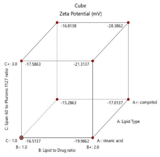 Cube diagram of effect of lipid type (X1), lipid to drug ratio (X2) and span 60 to Pluronic f127 ratio (X3) and on zeta potential (ZP).