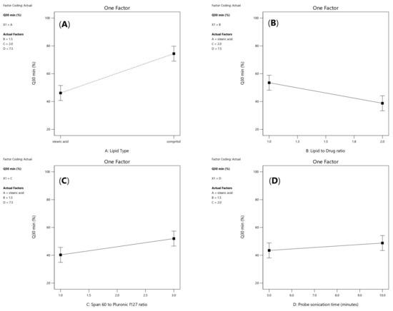 Linear plot of main effect of lipid type (X1) (A), lipid to drug ratio (X2) (B), span 60 to pluronic F127 ratio (X3) (C) and probe sonication time (X4) (D) on Q30min (%). Note: Q30min (%); percentage of drug released after 30 min.
