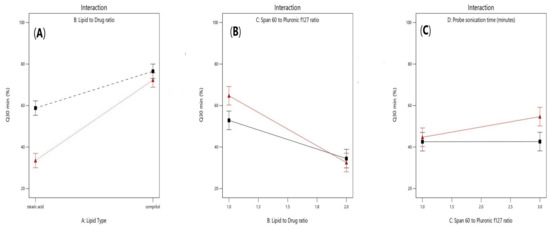 As shown in Figure 7A, a positive interaction had been noticed between the two factors (X1) and (X2) (p-value = 0.0027). Furthermore, as shown in Figure 7B, a significant negative interaction was observed between increasing lipid to drug ratio (X2) and increasing span 60 to Pluronic F127 ratio (p = 0.0155) because the HLB value of Span 60 is 4.7 while Pluronic F127 have HLB value of 22, so upon decreasing the amount of Pluronic F127 and increasing lipid concentration, the drug release will be hindered. Moreover, a positive significant interaction was observed between increasing probe sonication time (X4) and increasing span 60 to Pluronic f127 ratio (X3) (p = 0.0492), as shown in Figure 7C as increasing probe sonication time (10 min) will decrease the particle size of SLNs as well as increasing span 60 (3.75 mg/mL) to Pluronic F127 (1.25 mg/mL) ratio produced smaller vesicles owing to the larger structure of Pluronic F127 which constitutes of polyoxyethylene-polyoxypropylene triblock copolymer of general formula E 106 P 70 E 106, with an average molar mass of 13,000 [32,33].