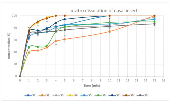 The average weight of the lyophilized nasal inserts ranged from 52.32 mg ± 4.5% to 94.384 mg ± 4.01% with a weight variation not exceeding 7.5% for each formulation. Therefore, the inserts fall within the acceptable weight variation range according to the European pharmacopeia limits [18].