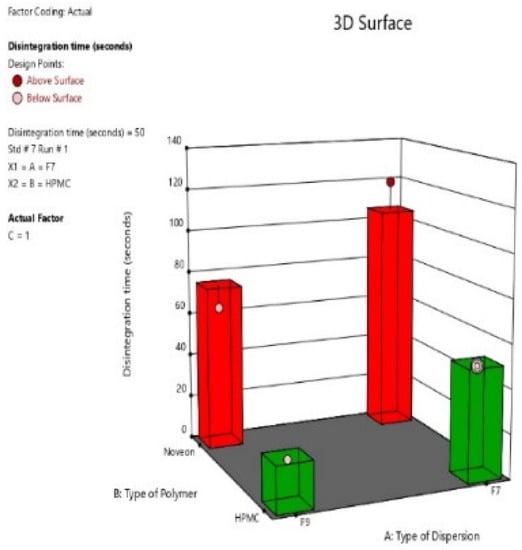 3D-diagram of main effect of type of selected (ATM-loaded SLNs) formula (F7 or F9) (X1) and type of polymer (HPMC K100 or NOVEON) (X2) on disintegration time.