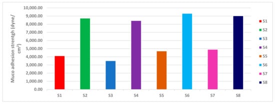 The mucoadhesion force for the selected nasal inserts (S4, S8) were (8436.6, 9025.2 dyne/cm2), respectively. As for the type of polymer, mucoadhesion force of NOVEON AA1 based nasal inserts showed greater mucoadhesion force than HPMC K100m based nasal inserts. According to the concentration of polymers mucoadhesion force of HPMC 1% relative to HPMC 0.5% (Figure 11) as when the concentration of the polymer increases, the number of penetrating polymer chains per unit volume of the mucin is increased and the interaction between the polymer and mucin become more stable [40].