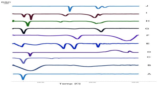 DSC thermogram of A: Pluronic F127, B: HPMC K100m, C: Span 60, D: Compritol 888 ATO, E: The best formula (S8), F: Polyvinyl alcohol (PVA), G: Mixture powder of excipients, H: The second optimized formula (S4), I: Atomoxetine + excipients physical mixture (1:1), J: Atomoxetine.