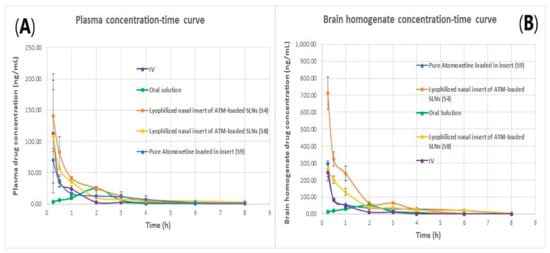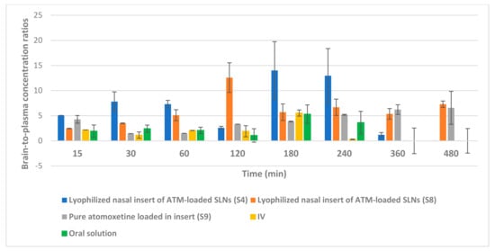 As shown in Figure 14, the intranasal (IN) administration of atomoxetine generated a rapid and extensive systemic absorption of the drug similarly to what occurred following IV injection, presenting higher values of Cmax, AUC 0–24 and similar values of Tmax together with an absolute bioavailability of 163.1 and 166.41% for S4 and S8, respectively. This probably occurred because of the small particle size of the solid lipid nanoparticles. Moreover, atomoxetine is a hydrophilic drug and most drugs that are extensively absorbed through the nasal respiratory epithelium are highly lipophilic and cross it by transcellular mechanisms so, increasing the lipophilicity of the drug by incorporating it into solid lipid nanoparticles will increase the permeation of the drug through the lipophilic blood brain barrier. Additionally, drug transport to the brain was enhanced through solubilization of the endothelial cell membrane lipids, by the surfactants used. Polyvinyl alcohol (PVA), Span 60 and Pluronic f127 incorporated into the prepared ATM-loaded SLNs led to membrane fluidization (surfactant effect). It was recognized that the hydrophobic surfaces of (SLNs) promote protein adsorption. Any shielding of the hydrophobic character of SLNs will thus sterically stabilize them, reducing opsonization and phagocytosis, and increasing brain residence time, blood circulation time and bioavailability. Recognition by the RES was prevented by coating particles with the hydrophilic surfactants (PVA and Pluronic F127) [46]. The two optimized (ATM-loaded SLNs) formulae, i.e., (S4) and (S8) showed higher brain tissue-to-plasma concentration ratios than oral solution, intravenous injection of atomoxetine solution and nasal insert of pure atomoxetine solution which indicates the successful direct nose-to-brain drug delivery, brain deposition and overcoming the systemic clearance of the drug, as shown in Figure 15.