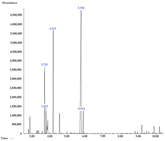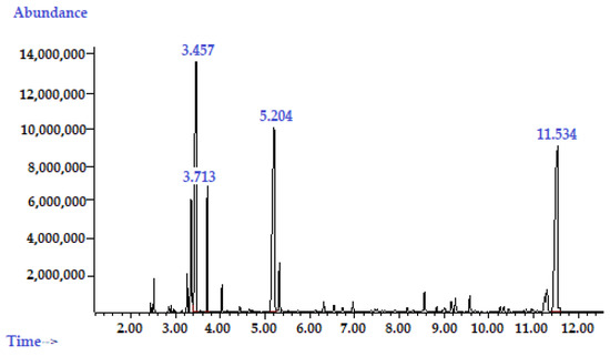 The GC/MS analysis was conducted using an Agilent Technologies 6890N gas chromatograph coupled with a 7000 mass spectrometer (Agilent, Santa Clara, CA, USA) and an HP-5 MS low-bleed capillary column (20 m × 0.18 mm i.d., 0.18 μm film thickness (Agilent Technologies, Santa Clara, CA, USA)). The sample for analysis was prepared by the addition of 50 μL of the TTO to 1 mL chloroform. An injection volume of 1 μL was subjected to a splitless mode (1:30) during the GC/MS analysis. Helium was used as the carrier medium at a constant flow rate of 1.25 mL/min. The oven temperature was programmed as follows: maintained at 80 °C for 1 min, then programmed to increase to 140 °C at 10 °C/min, raised to 280 °C at 20 °C/min, and finally kept at 280 °C for 20 min. The MS was programmed as follows: ion source temperature at 230 °C, interface temperature at 280 °C, ionization voltage at 70 eV, and a scan range of m/z 29 to 500 amu. The chemical identification was performed by comparing the obtained phytoconstituent profiles with the corresponding reference retention indices (RIs) and the mass spectra in the NIST-2017 (National Institute of Standards and Technology, Gaithersburg, MD, USA) and Wiley-08 (Wiley, New York, NY, USA) databases, and the Adams libraries [42,70,71], as well as by comparing their GC/MS characteristics with the available published data [72,73,74]. These analyses were carried out in triplicate.