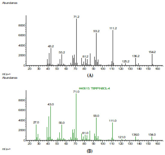 (А) Mass spectrum of terpinen-4-ol in TTO; (B) Mass spectrum of terpinen-4-ol from the NIST-2017 library.