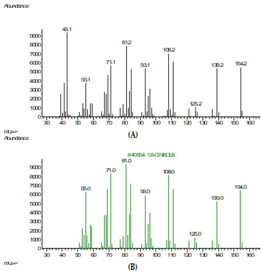 (А) Mass spectrum of 1,8-cineole of pure sample; (B) Mass spectrum of 1,8-cineole from the NIST-2017 library.