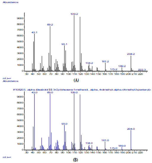 (А) Mass spectrum of α-(-)-bisabolol from the plant-based substance (TTO:1,8-cineole:α-(-)-bisabolol in a 1:1:1 ratio); (B) Mass spectrum of α-(-)-bisabolol from the NIST-2017 library.