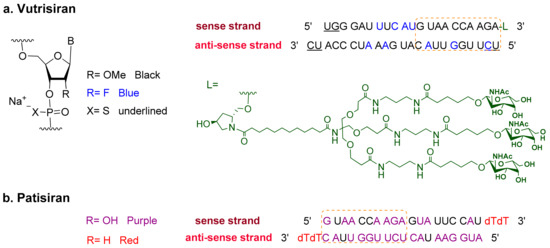 Chemical structure of (a). Vutrisiran (AmvuttraTM) [6] vs. (b) Patisiran (OnpattroTM) [11].
