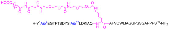 Tirzepatide is a 39-mer peptide amide that comprises a C20 fatty acid di-acid moiety that binds to albumin [25], thus extending its period of action and offering the possibility of weekly administration [26]. It has two unnatural amino acids (Aib) at positions 2 and 13 that enhance its resistance to peptidase [27]. The 1,20-eicosanedioic acid moiety is derived from the ε-amino function of Lys20. Tirzepatide has a molecular weight of 4813.53 g/mol (Figure 4).