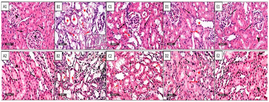 - Abouzed, T.K.; Sherif, E.A.E.; Barakat, M.E.S.; Sadek, K.M.; Aldhahrani, A.; Nasr, N.E.; Eldomany, E.; Khailo, K.; Dorghamm, D.A. Assessment of Gentamicin and Cisplatin-Induced Kidney Damage Mediated via Necrotic and Apoptosis Genes in Albino Rats. BMC Vet. Res. 2021, 17, 350. [Google Scholar] [CrossRef]