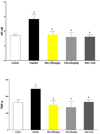 2.2. NAC and/or CGA Reduced Cp-Induced Oxidative Stress