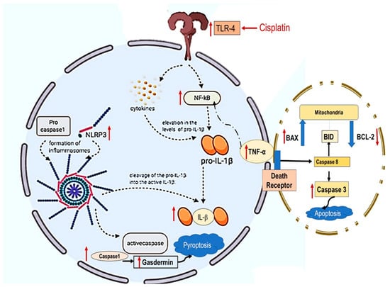 - Yan, H.; Luo, B.; Wu, X.; Guan, F.; Yu, X.; Zhao, L.; Ke, X.; Wu, J.; Yuan, J. Cisplatin Induces Pyroptosis via Activation of MEG3/NLRP3/Caspase-1/GSDMD Pathway in Triple-Negative Breast Cancer. Int. J. Biol. Sci. 2021, 17, 2606–2621. [Google Scholar] [CrossRef]