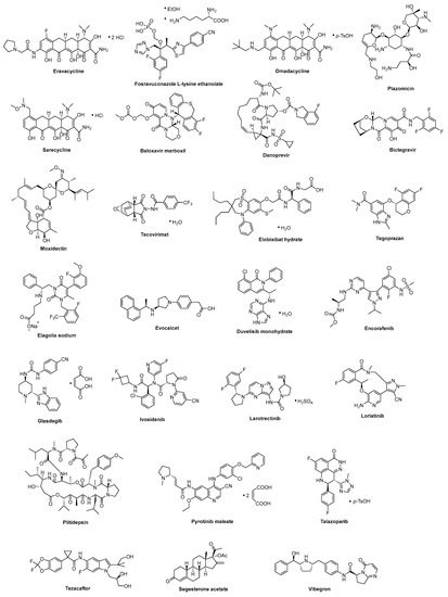 - Markham, A.; Keam, S.J. Omadacycline: First Global Approval. Drugs 2018, 78, 1931–1937. [Google Scholar] [CrossRef]