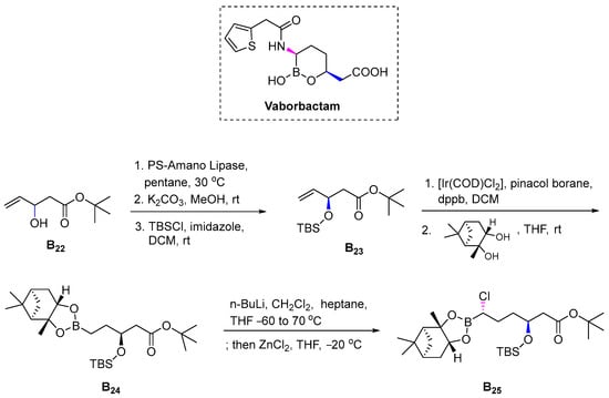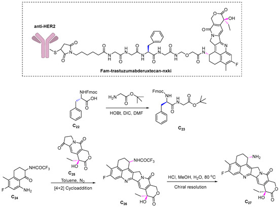 - The linker C23 with one chiral center is obtained by a chiral pool approach (i.e., amino acid derivative C22 imparts its stereocenter to the drug);