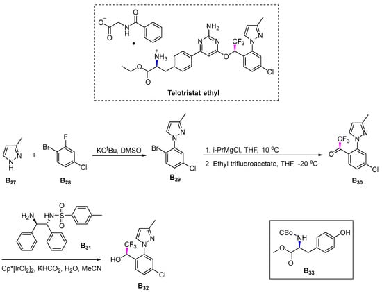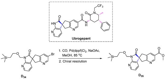 - Chiral fragment C33 then undergoes coupling with 1-bromo-2,3-difluorobenzene C34 resulting in an intermediate C35 with two stereocenters;