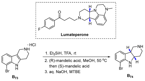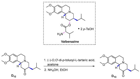 - Boldt, K.G.; Biggers, M.S.; Phifer, S.S.; Brine, G.A.; Rehder, K.S. Synthesis of (+)- and (−)-Tetrabenazine from the Resolution of A-Dihydrotetrabenazine. Synth. Commun. 2009, 39, 3574–3585. [Google Scholar] [CrossRef]