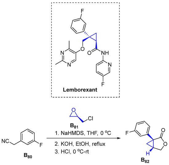 - Bassan, E.M.; Baxter, C.A.; Beutner, G.L.; Emerson, K.M.; Fleitz, F.J.; Johnson, S.; Keen, S.; Kim, M.M.; Kuethe, J.T.; Leonard, W.R.; et al. Multikilogram Scale Synthesis of a Chiral Cyclopropanol and an Investigation of the Safe Use of Lithium Acetylide−Ethylene Diamine Complex. Org. Process Res. Dev. 2012, 16, 87–95. [Google Scholar] [CrossRef]
