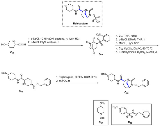 - Miller, S.P.; Limanto, J.; Zhong, Y.L.; Yasuda, N.; Liu, Z. Preparation of Tert-Butyl 4-((1R,2S,5R)-6-(benzyloxy)-7-oxo-1,6-diazabicyclo[3.2.1]octane-2- Carboxamido Piperidine-1-Carboxylate. WO2014200786, 18 December 2014. [Google Scholar]