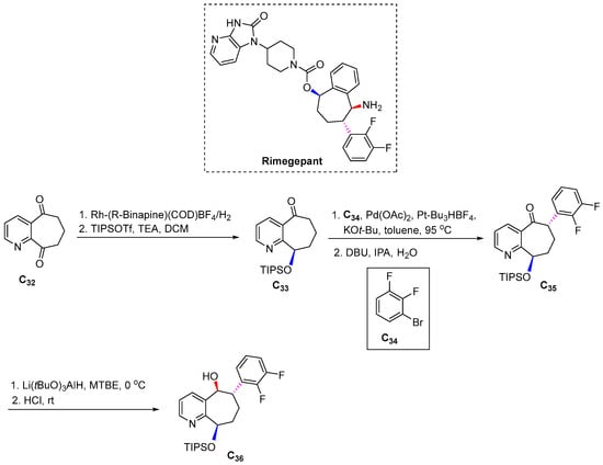 - Rhodium-catalyzed reduction of pyridine derivative C32 followed by hydroxyl protection with triisopropylsilyl trifluoromethanesulfonate (TIPSOTf) results in a chiral intermediate C33;