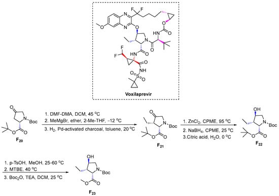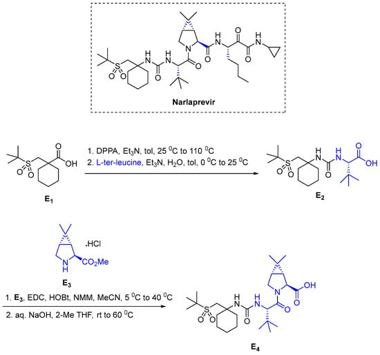 - Allan, K.M.; Fujimori, S.; Heumann, L.V.; Huynh, G.M.; Keaton, K.A.; Levins, C.M.; Pamulapati, G.R.; Roberts, B.J.; Sarma, K.; Teresk, M.G.; et al. Processes for Preparing Peptide Analog as Antiviral Agent. WO 2015191437A1, 17 December 2015. [Google Scholar]