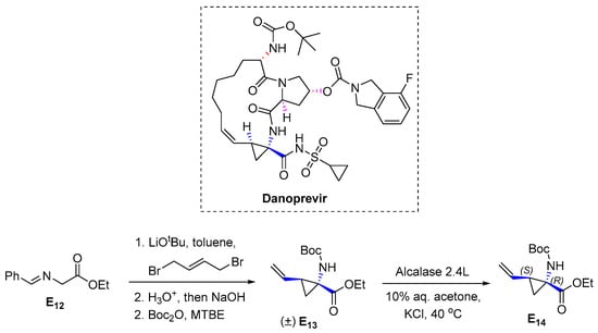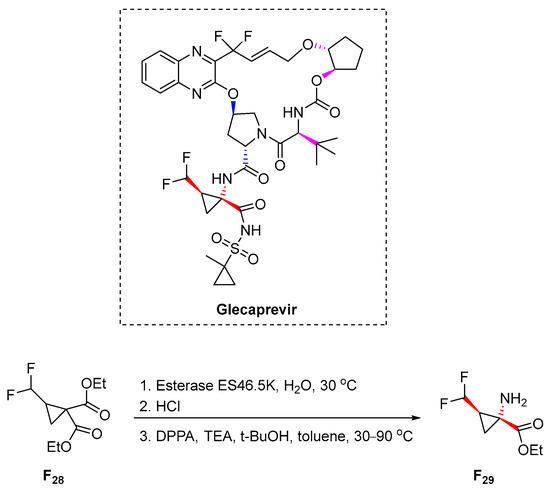 - Cagulada, A.; Chan, J.; Chan, L.; Colby, D.A.; Karki, K.K.; Kato, D.; Keaton, K.A.; Kondapally, S.; Levins, C.; Littke, A.; et al. Synthesis of an Antiviral N-(3-Ethyl)prolyl-1- aminocyclopropanecarboxylic Acid Peptide and New Routes to Its Difluoromethylaminocyclopropanecarboxylic Acid Intermediate. US 20150175626A1, 13 September 2016. [Google Scholar]