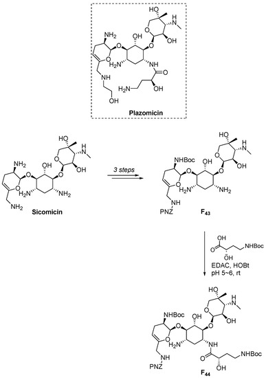 - Aggen, J.B.; Armstrong, E.S.; Goldblum, A.A.; Dozzo, P.; Linsell, M.S.; Gliedt, M.J.; Hildebrandt, D.J.; Feeney, L.A.; Kubo, A.; Matias, R.D.; et al. Synthesis and Spectrum of the Neoglycoside ACHN490. Antimicrob. Agents Chemother. 2010, 54, 4636–4642. [Google Scholar] [CrossRef]