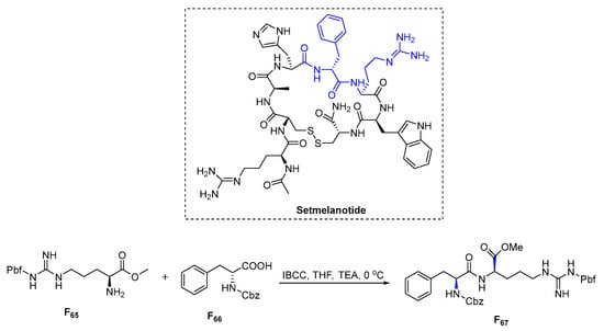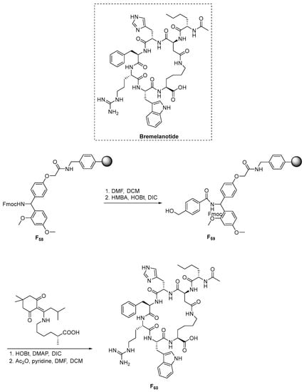 - Yan, L.; Wang, B.; Li, J.; Jin, Y.; Wang, J.; Yang, Z. A Synthetic Method for Bremelanotide. CN10658911, 29 December 2020. [Google Scholar]