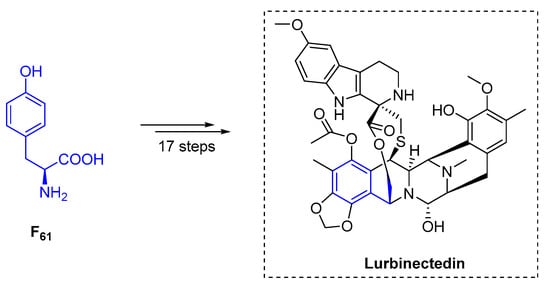 - He, W.; Zhang, Z.; Ma, D. A scalable Total Synthesis of the Antitumor Agents Et743 and Lurbinectedin. Angew. Chem. Int. Ed. Engl. 2019, 58, 3972–3975. [Google Scholar] [CrossRef]
