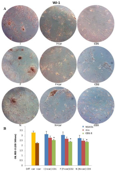 At the same time, the subculture WJ-1 was grown in an adipogenic differentiation medium until total differentiation (17 days) and treated with NSAIDs alone, a physical mixture of the selected NSAID and 25 μM Car, and CD1-3. As shown in Figure 2, ibuprofen, flurbiprofen, and naproxen showed an adipogenic action compared with the control (diff − Car). Compared to 3T3-L1 cells, both the physical mixtures (selected NSAID and Car) and CD1-3 reduced adipogenesis.