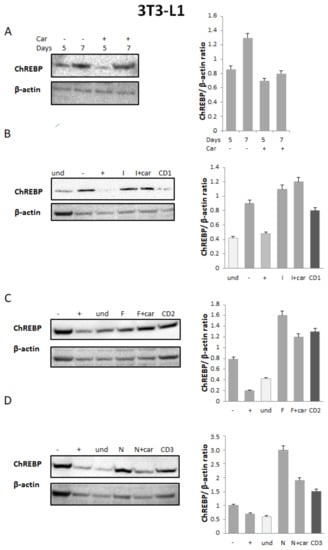 Since the transcription factor, ChREBP, is the major factor responsible for de novo lipogenesis, we analyzed its modulation by NSAIDs alone, a physical mixture of the selected NSAID and 25 μM Car, and CD1-3 in 3T3-L1 cells. Western blot and densitometric analysis showed that ChREBP protein levels increased during adipogenic differentiation, whereas they were reduced by both Car and CD1-3 (Figure 3). The maximum expression of ChREBP was at 7 days of differentiation (Figure 3A), which was comparable to NSAIDs (Figure 3B–D). The highest reduction in ChREBP protein levels was obtained after treatment with CD3 (Figure 3D). It has been reported that the reduction in ChREBP expression levels by various anti-adipogenic compounds is a valid therapeutic method for counteracting obesity, so CD3 possessing this property could be proposed for a deepened investigation.