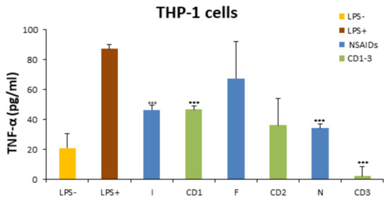 The potential anti-inflammatory effect of CD1-3 on THP-1-derived macrophages through the release of TNF-α levels was analyzed by the ELISA assay. To obtain an in vitro inflammatory experimental model, THP-1 cells were stimulated with LPS, a major inducer of the production and release of TNF-α [42]. THP-1 cells were also treated with NSAIDs. We showed that, compared with untreated cells, TNF-α production was remarkably increased after LPS stimulation for 24 h (TNF-α = 87.20 ± 2.605 pg/mL), while the treatment with CD1-3 for 24 h led to a reduction in TNF-α levels with respect to the LPS-treated cells (CD1 = 46.70 ± 2.246 pg/mL; CD2 = 36.14 ± 17.791 pg/mL) (Figure 4). Interestingly, THP-1 cells showed a drastic decrease in TNF-α levels when treated with CD3 (2.0 ± 6.595 pg/mL). Statistical significance was reported in comparison to both LPS-treated cells and untreated cells (Figure 4).