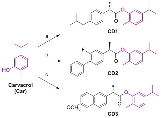 - De Oliveira Pedrosa Rolim, M.; de Almeida, A.R.; da Rocha Pitta, M.G.; de Melo Rêgo, M.J.B.; Quintans-Júnior, L.J.; de Souza Siqueira Quintans, J.; Heimfarth, L.; Scotti, L.; Scotti, M.T.; da Cruz, R.M.D.; et al. Design, synthesis and pharmacological evaluation of CVIB, a codrug of carvacrol and ibuprofen as a novel anti-inflammatory agent. Int. Immunopharmacol. 2019, 76, 105856. [Google Scholar] [CrossRef]